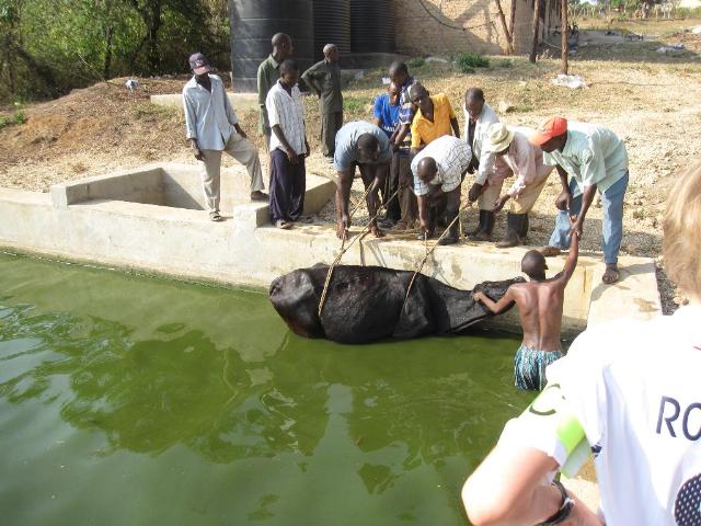 One of our cows, blind, stumbled into our fish pond and spent the better part of a weekend trapped inside, hopelessly churning circles trying to find a way out. So how do you get a cow out of a four foot deep pond? Like everything else in Uganda… labour! And a bare minimum of external equipment.